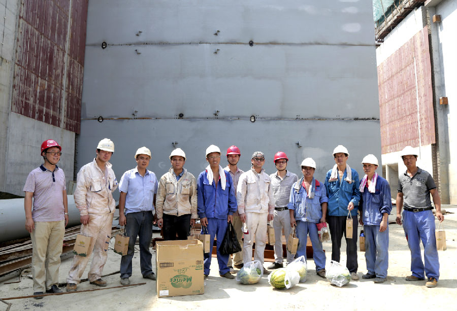 7月25日,水機(jī)公司黨委書(shū)記田建京、工會(huì)主席黃統(tǒng)及相關(guān)項(xiàng)目負(fù)責(zé)人一行8人前往芒稻閘、邵仙閘項(xiàng)目施工現(xiàn)場(chǎng)開(kāi)展 “送清涼”活動(dòng),慰問(wèn)戰(zhàn)斗在高溫酷暑下的一線(xiàn)員工,送去防暑降溫用品、西瓜和慰問(wèn)金,囑托現(xiàn)場(chǎng)員工注意施工安全,合理調(diào)整作息時(shí)間,采取必要的防暑降溫措施,團(tuán)結(jié)一心,攻堅(jiān)克難,確保優(yōu)質(zhì)高效地完成項(xiàng)目施工任務(wù)。